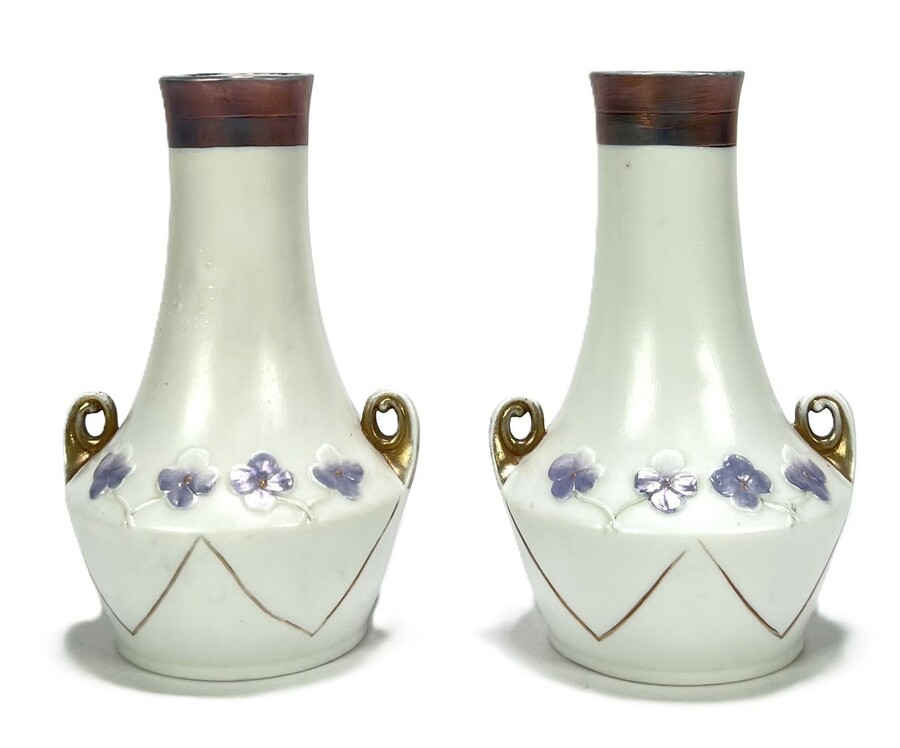 Twee Jugendstil porseleinen vaasjes met floraal decor. Ongesigneerd, Oostenrijk, begin 20e eeuw.