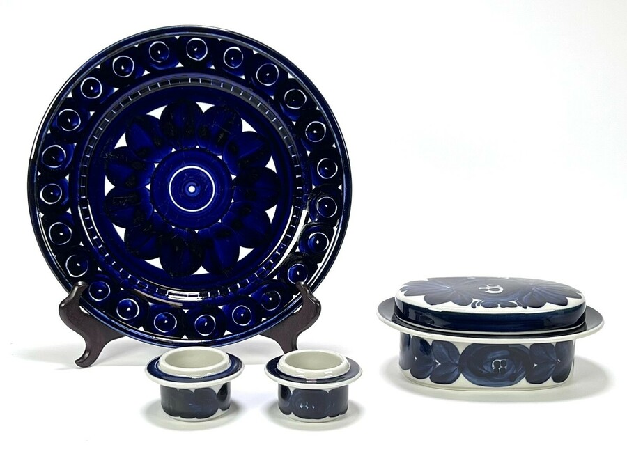 Keramieken Arabia serviesfragment naar ontwerp van Ulla Procopé met kobaltblauw bord, decornaam Valencia, twee eierdoppen en een botervloot uit de Anemon Bleu collectie. Aan de onderzijde gemerkt, Finland, jaren 60.