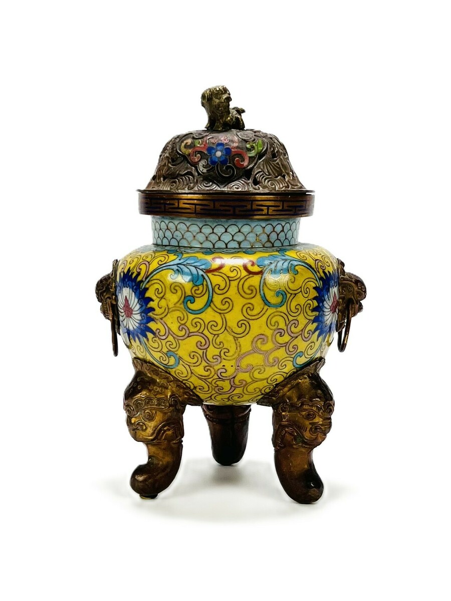 Chinese cloisonné wierookbrander met polychroom geëmailleerd decor met bloemen, staande op drie drakenpoten. China, 19e eeuw.