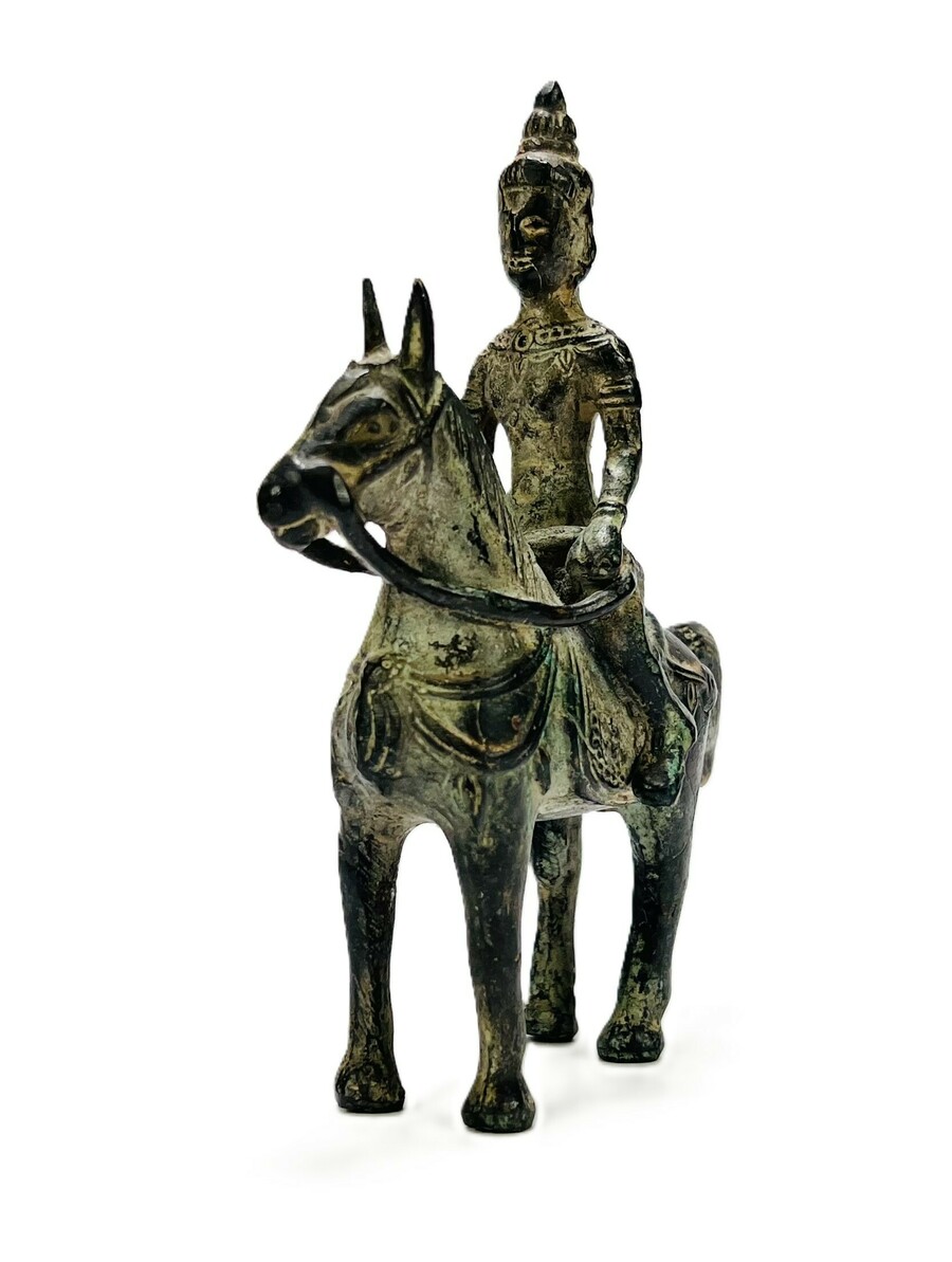 Bronskleurig gepatineerd beeldje van Khandoba te paard, uitgevoerd in een metaallegering. India, 20e eeuw.