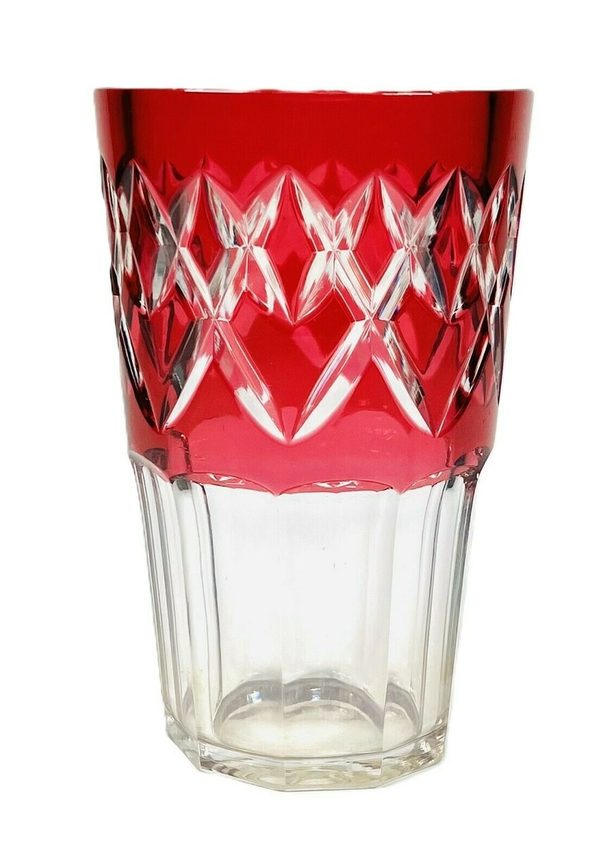 Kristallen rode überfang vaas met geslepen facetten en kruispatroon van Val Saint Lambert. Vaas is aan de onderzijde gemerkt middels gravering. Seraing, België, derde kwart 20e eeuw.