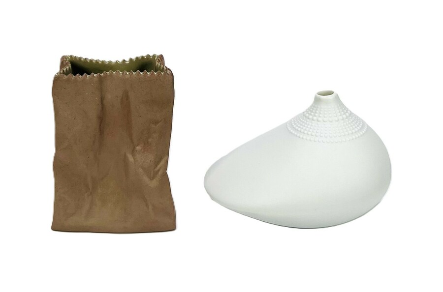 Twee porseleinen vaasjes van Rosenthal naar ontwerp van Tapio Wirkkala, modelnaam "Paper bag" en "Pollo". Beide vazen aan de onderzijde gemerkt, Duitsland, vierde kwart 20e eeuw.