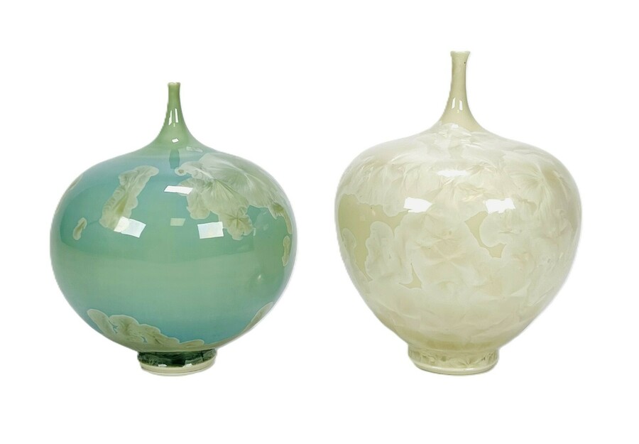 Twee porseleinen taps toelopende vaasje voorzien van hoogglanzende kristalglazuur door Willy van Bussel. Aan de onderzijde gemerkt met B, begin 21e eeuw.