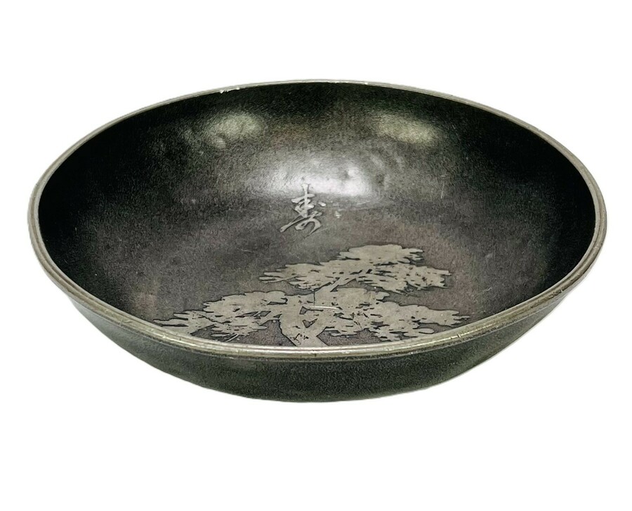 Tinnen Japanse schaal landschappelijk gedecoreerd met naaldboom en karakters, gesigneerd aan de onderzijde. Meiji periode, omstreeks 1900.