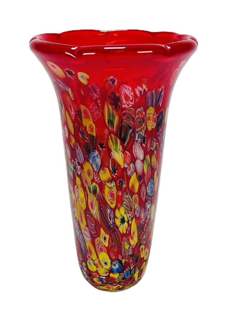 Murano stijl rode kristallen vaas met veelkleurig millefiori decor. Eind 20e eeuw.