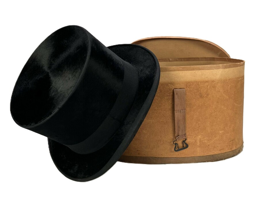 Hoge hoed van beverbont van hoedenfabrikant A. Casse Paris voor Eduard Pelger, Prinsenstraat 35, ‘s-Gravenhage. Compleet met originele hoedendoos, tweede kwart 20e eeuw.