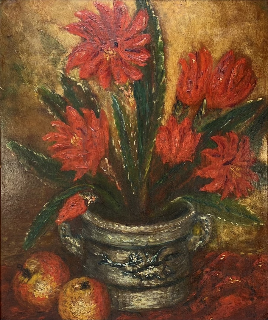 Schilderij van een bloemstilleven met appels in Keulse pot. Olieverfschilderij op board, ongesigneerd, midden 20e eeuw.