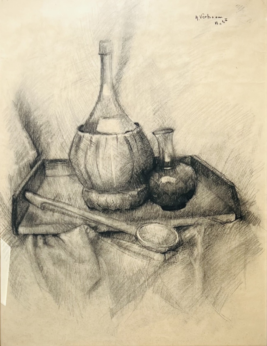 Potloodtekening van een stilleven met een Chianti fles door H. Verboom. Rechtsboven gesigneerd, midden 20e eeuw.