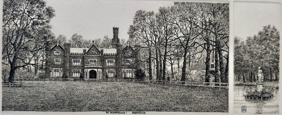 Ets getiteld “De Schaffelaar Barneveld” door Wim van der Meij (1949). Rechtsonder voluit met potlood gesigneerd en gedateerd 1994. Oplagenummer 21/200.
