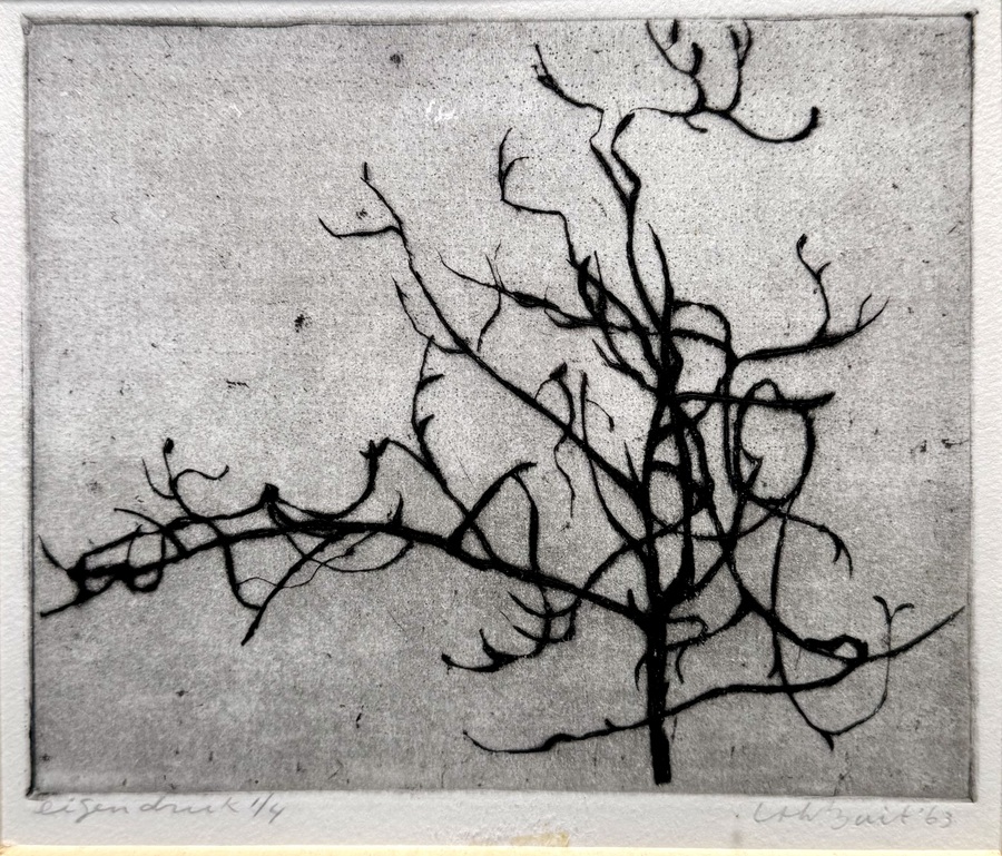 Ets van een tak zonder bladeren, gemaakt door Thijs Buit (1934). Linksonder vermelding eigen druk en oplagenummer 1/4, rechtsonder gesigneerd en datering '63.