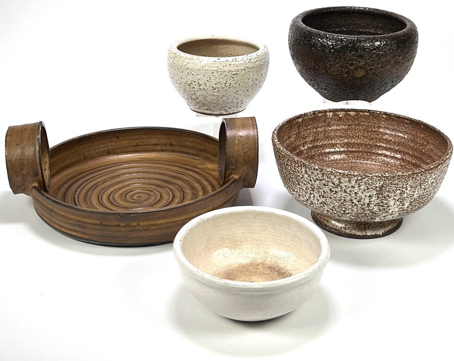 Convoluut keramiek met grote schaal met handvaten van Jan de Graaf (Elburg), bloempotten van Zaalberg en De Rijn (Leiderdorp). Jaren 70.