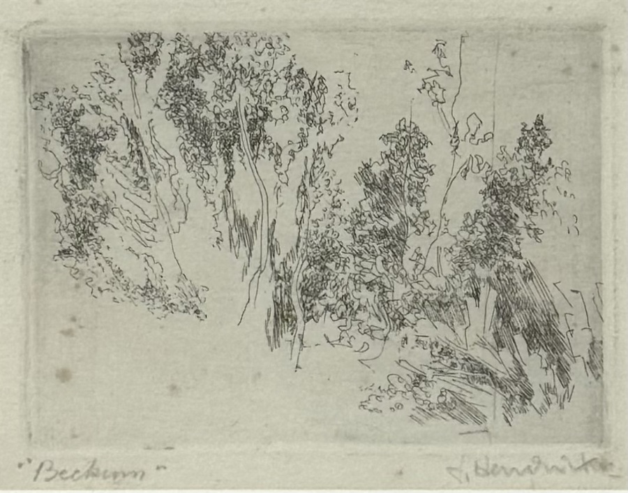 Ets van een bosgezicht getiteld "Beckum". Rechtsonder onduidelijk gesigneerd, 2e helft 20ste eeuw.