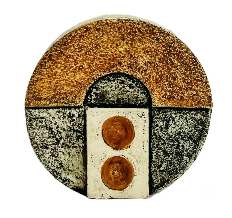 Bruin groene keramieken ronde vaas door Troika Cornwall met reliëfdecoratie van abstracte vormen en mensfiguur. Onderzijde gemerkt Troika en monogram. Engeland, jaren 70.