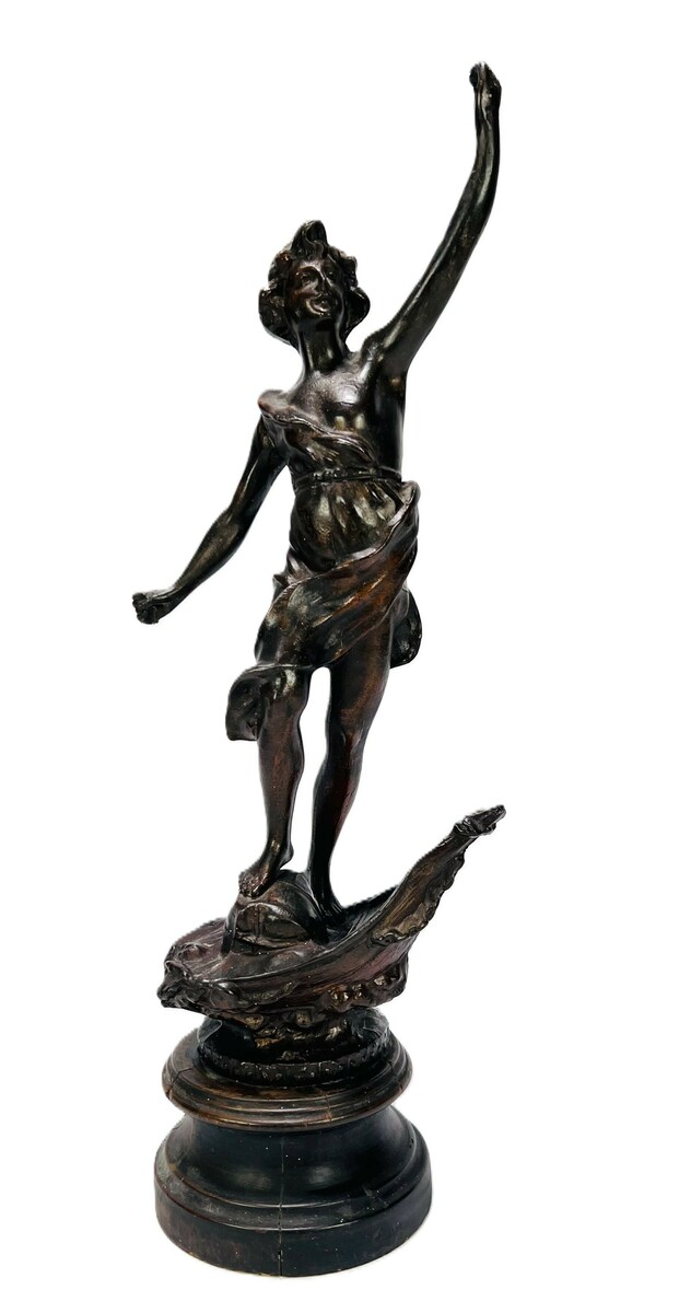 Frans bronskleurig gipsen beeld op houten sokkel van heroïsche vrouw op boeg. Frankrijk, begin 1900.