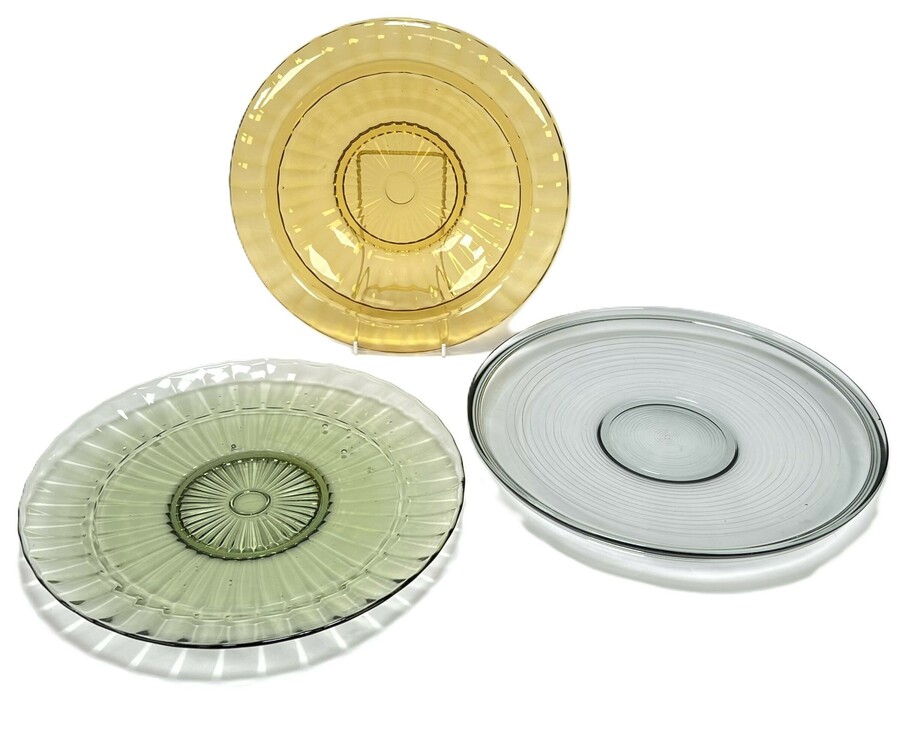 Drie persglazen schalen waarvan twee gekleurde schalen naar ontwerp van Andries Dirk Copier, modelnaam Hollandia en een helderglazen schaal uit de Primula serie uitgevoerd door de glasfabriek Leerdam, eind jaren 30/40.