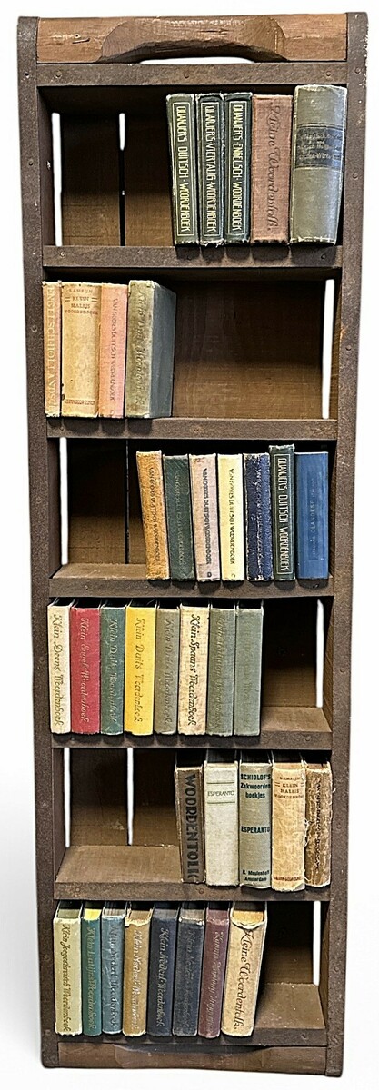 Woordenboeken in verschillende talen in een houten bak, 20ste eeuw.