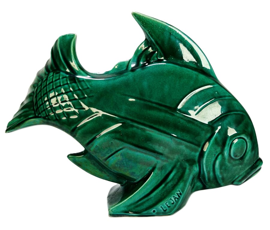Art Deco groen geglazuurd keramieken beeld van een vis door Lejan. Aan de achterzijde gesigneerd, betreft een beeld op groter formaat, Frankrijk, jaren 30.