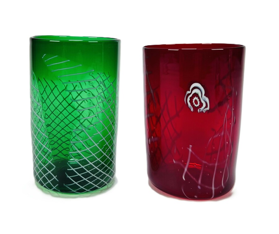 Twee ambachtelijk gevormde Murano kristallen glazen met filigraan decor. Aan de onderzijde gemerkt, pontil onderzijde aanwezig, Venetië, jaren 80/90.
