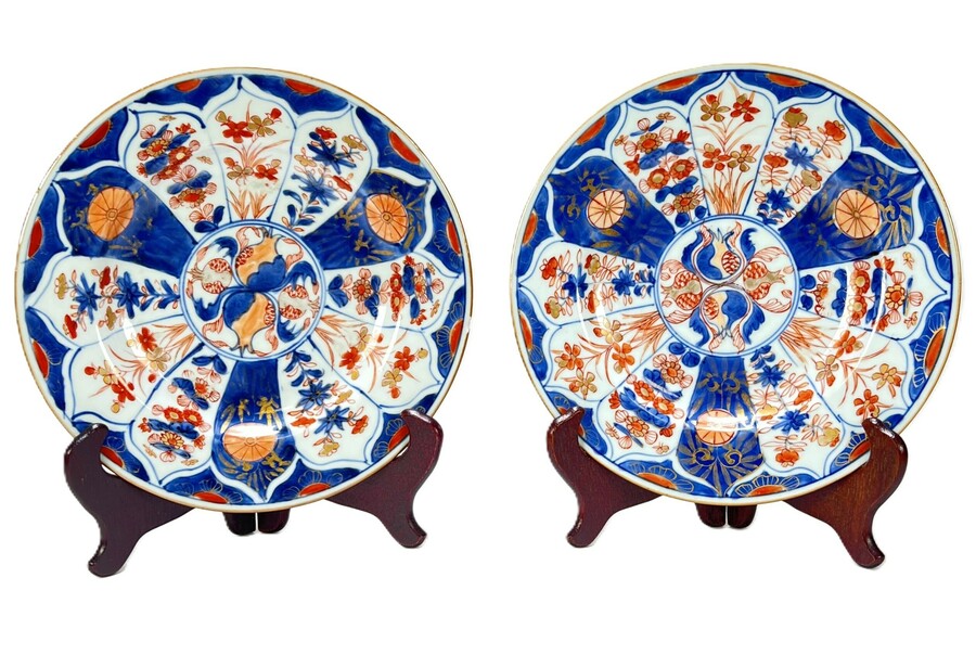 Twee porseleinen goud Imari borden met botanisch decor in cartouches en granaatappels in centraal medaillon. China, 18e/19e eeuw.