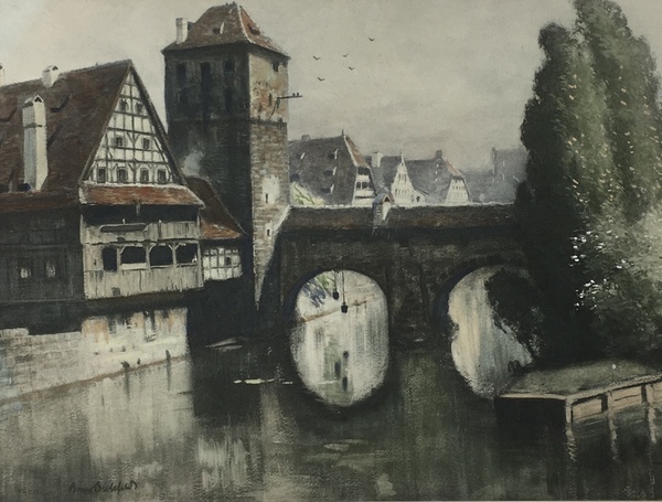 Kleurenlitho getiteld “Henkersteg” stadsgezicht van Neurenberg door Bruno Bielefeld (1879-1973). Duitsland, tweede kwart 20e eeuw.