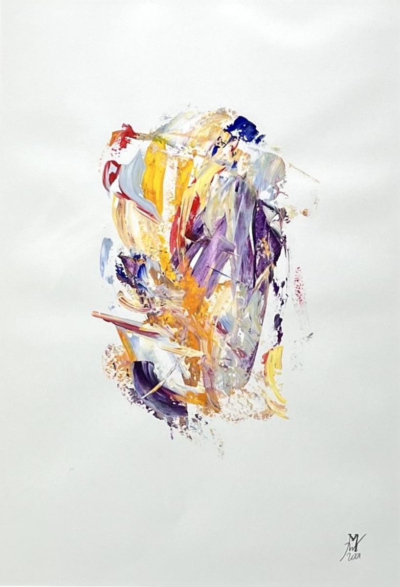 Schilderij met polychrome abstracte compositie. Olieverf op papier, rechtsonder gemonogrammeerd en gedateerd 2001.