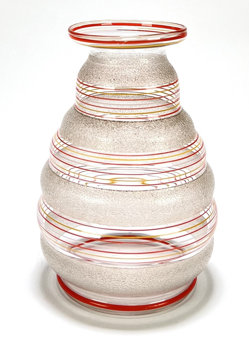 Glazen Art Deco vaas met met horizontaal oranje-geel ringdecor en geëtste banden. België, jaren 30.