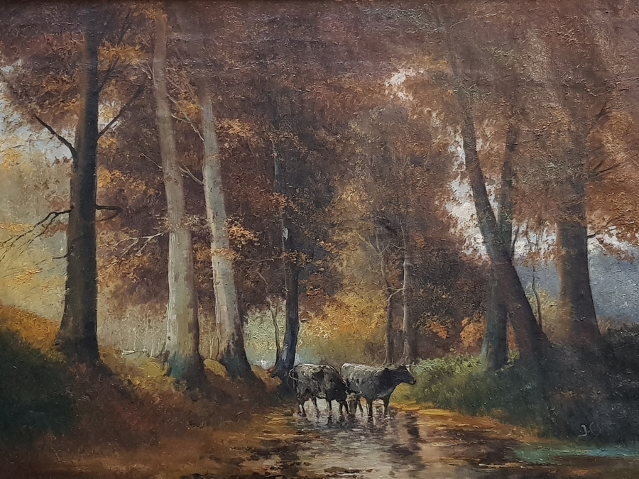 Schilderij van een boslandschap met koeien. Olieverfschilderij op linnen, rechtsonder onduidelijk gesigneerd, 20e eeuw.