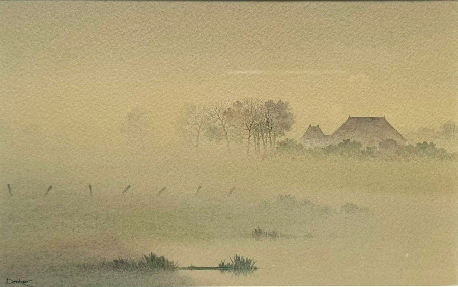 Aquarel van landschap Gaasterland in Friesland door Denkor, pseudoniem van A.J. Kooter (1944). Aquarel op papier, linksonder gesigneerd Denkor, jaren 80.