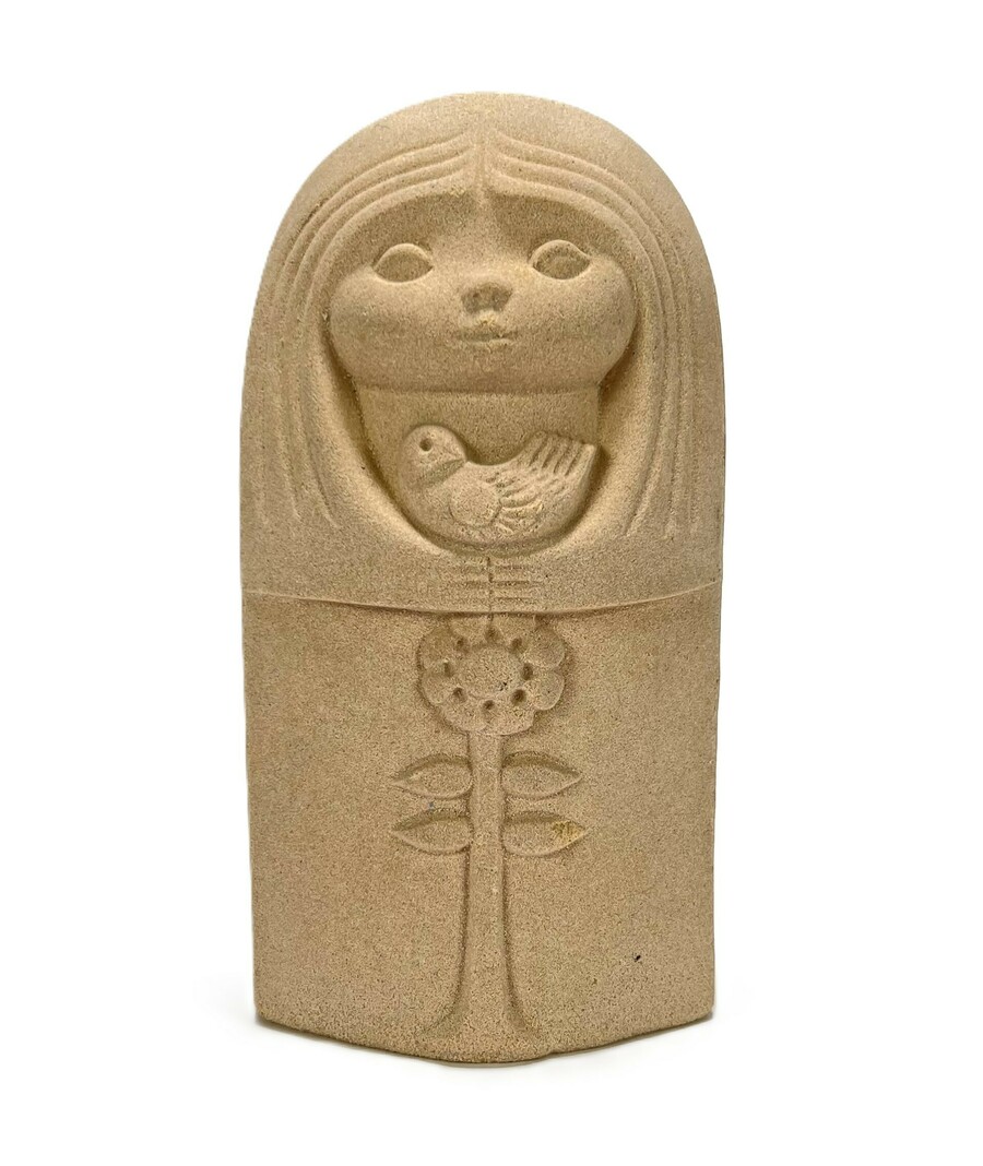 Stenen beeld van meisje met vogel en bloem door StoneArt, de onderzijde gemerkt met zegel. België, jaren 70.