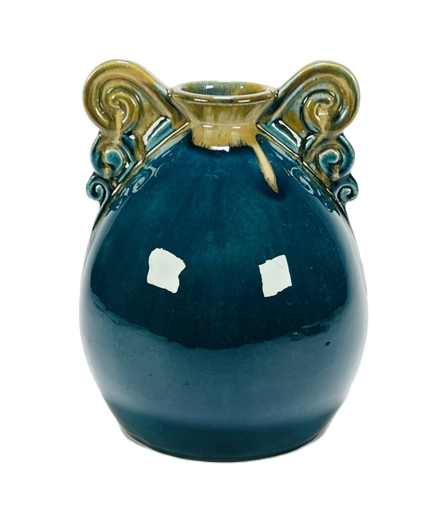 Art Deco keramieken petrolkleurige geglazuurde vaas geflankeerd door handvaten. Aan de onderzijde gesigneerd, Frankrijk, jaren 30.
