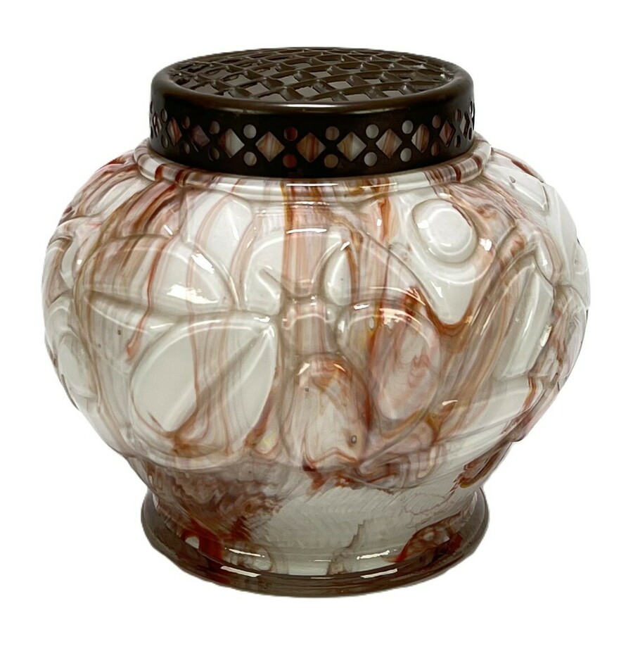 Glazen Art Deco vaas gedecoreerd met geabstraheerd bloemdecor naar ontwerp van Henri Heemskerk, uitgevoerd door glasfabriek Scailmont. Compleet met bronskleurige bloemsteker, gemerkt aan de onderzijde Made in Belgium, omstreeks 1930.