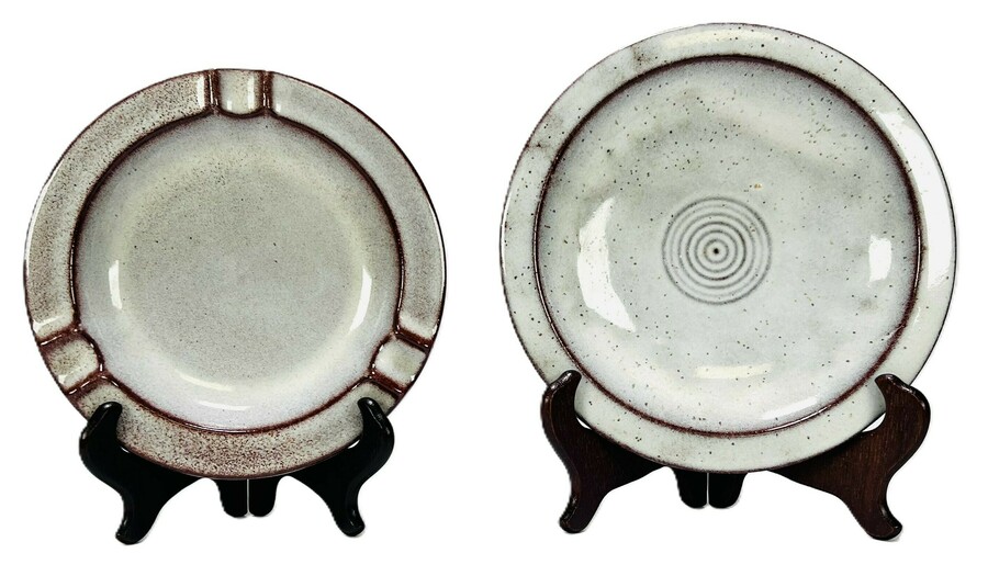 Keramieken bord met centraal cirkel decor en asbak door Westraven Utrecht. Aan de onderzijde gemerkt, jaren 60/70.