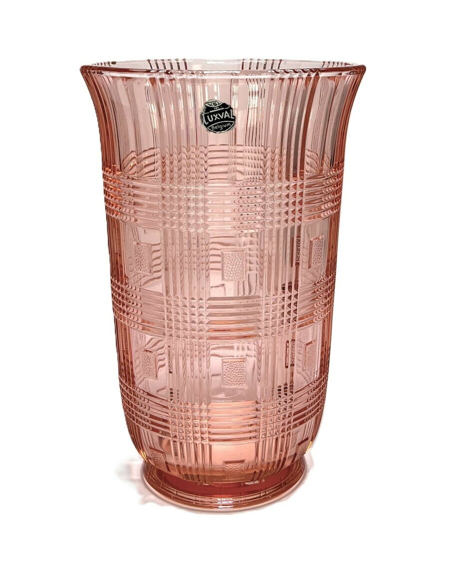 Oudrose glazen vaas van Val Saint Lambert uit de Luxval reeks, modelnummer 941. Voorzien van originele sticker, België, gepubliceerd in catalogus Luxval 1935.