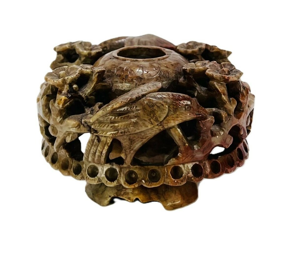 Spekstenen inktpot gedecoreerd met bloemen en vogels. China, eerste helft 20e eeuw.