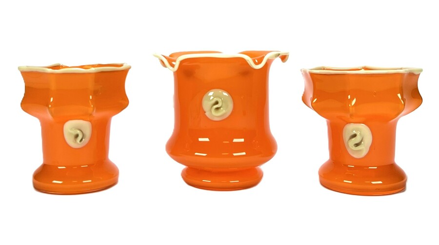 Drie oranje kleurige Art Deco Tango glas vazen met crèmekleurige rand en applicaties, toegeschreven aan Kralik, Bohemen, Tsjechoslowakije, tweede kwart 20e eeuw.