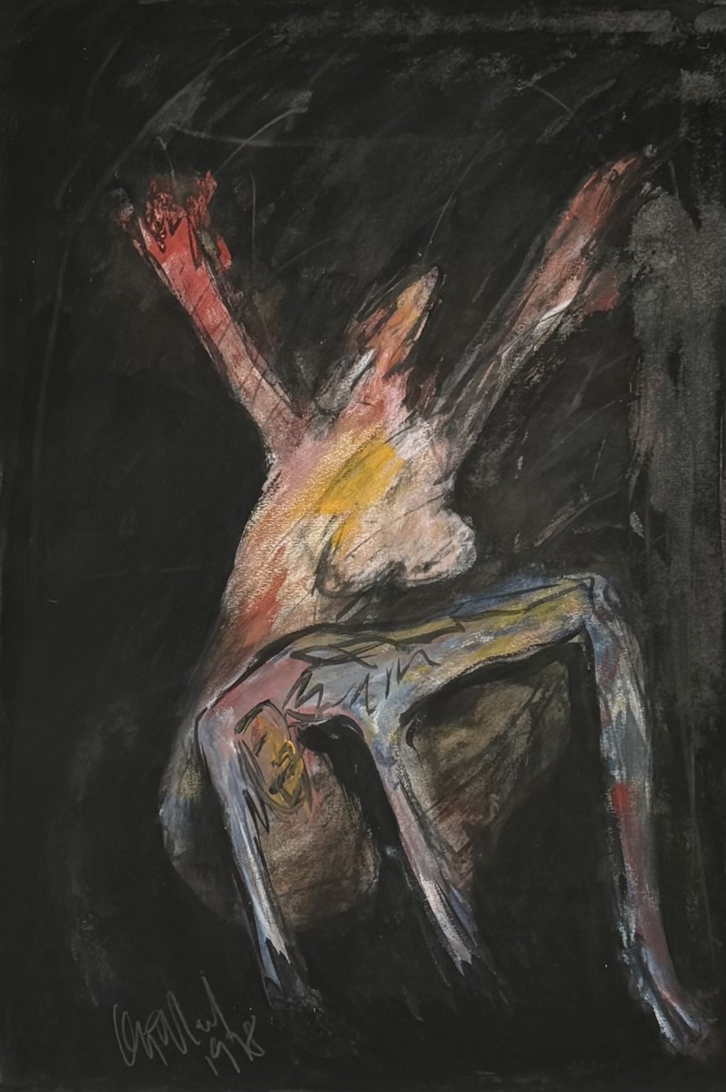 Schilderij van vrouw met tafel in neo-expressionistische stijl. Gemengde techniek, acryl op papier, rechtsonder met potlood gesigneerd en gedateerd 1998.