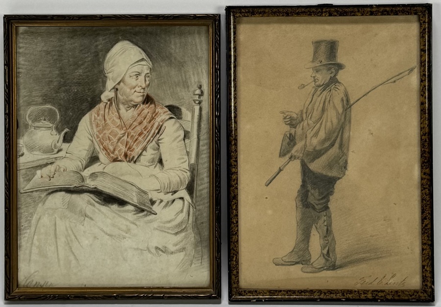 Twee tekeningen, een lezende vrouw door Lambertus Johannes Hansen (1803-1859) en een tekening van een koetsier door Ferdinand Ernst Lintz (1833-1909). 19e eeuw.