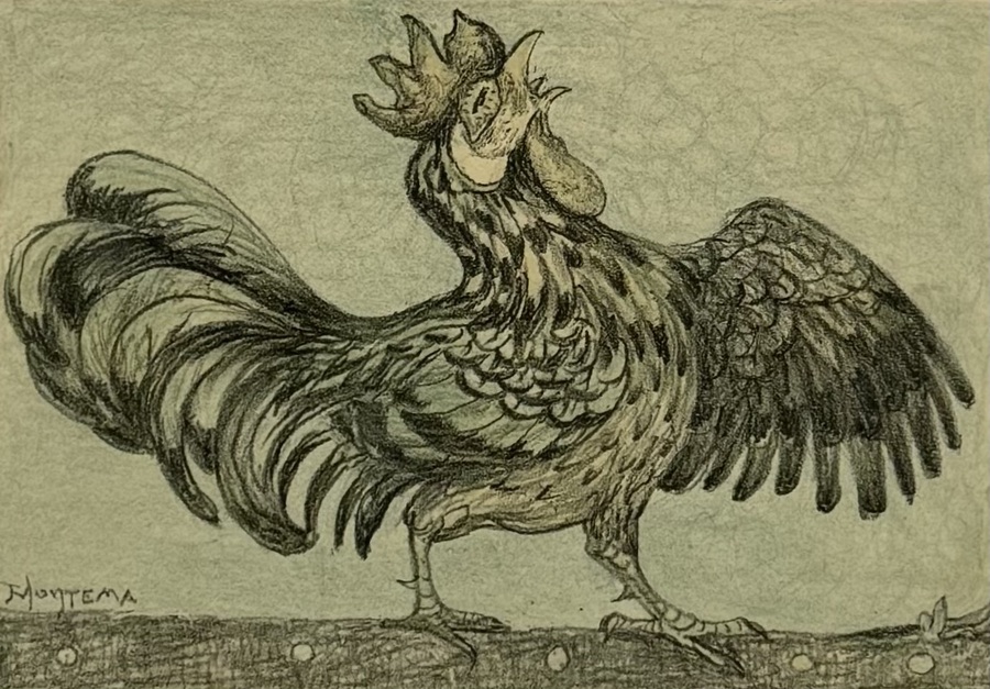 Litho van een kraaiende haan door Theo van Hoytema (1863-1917). Linksonder in de druk gesigneerd, jaren 20/30.