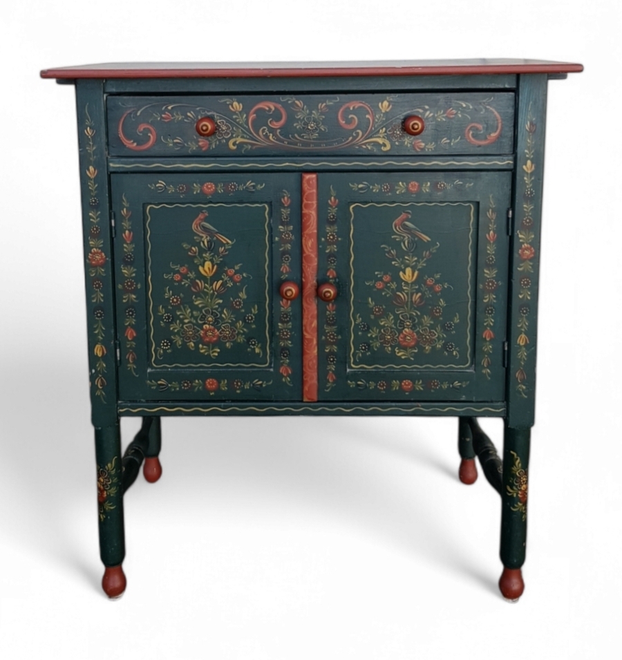 Hindeloopen beschilderde kast met twee deuren, een lade en uitschuif bladen aan de zijkanten. Midden 20e eeuw.