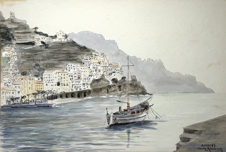 Aquarel getiteld “Amalfi” door Wim Abeleven (1903-1967). Gemengde techniek pen/aquarel op papier, rechtsonder gesigneerd en getiteld, midden 20e eeuw.