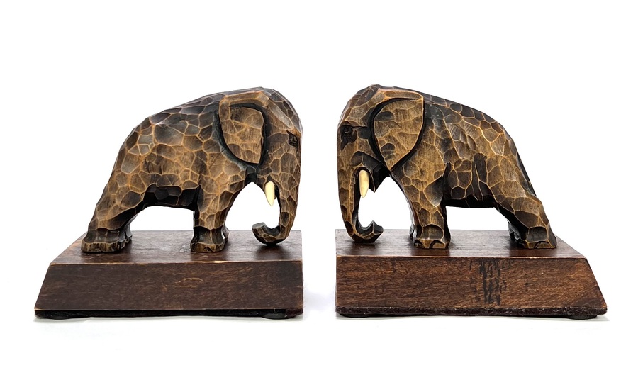 Houten boekensteun in de vorm van olifanten. Jaren 60/70.