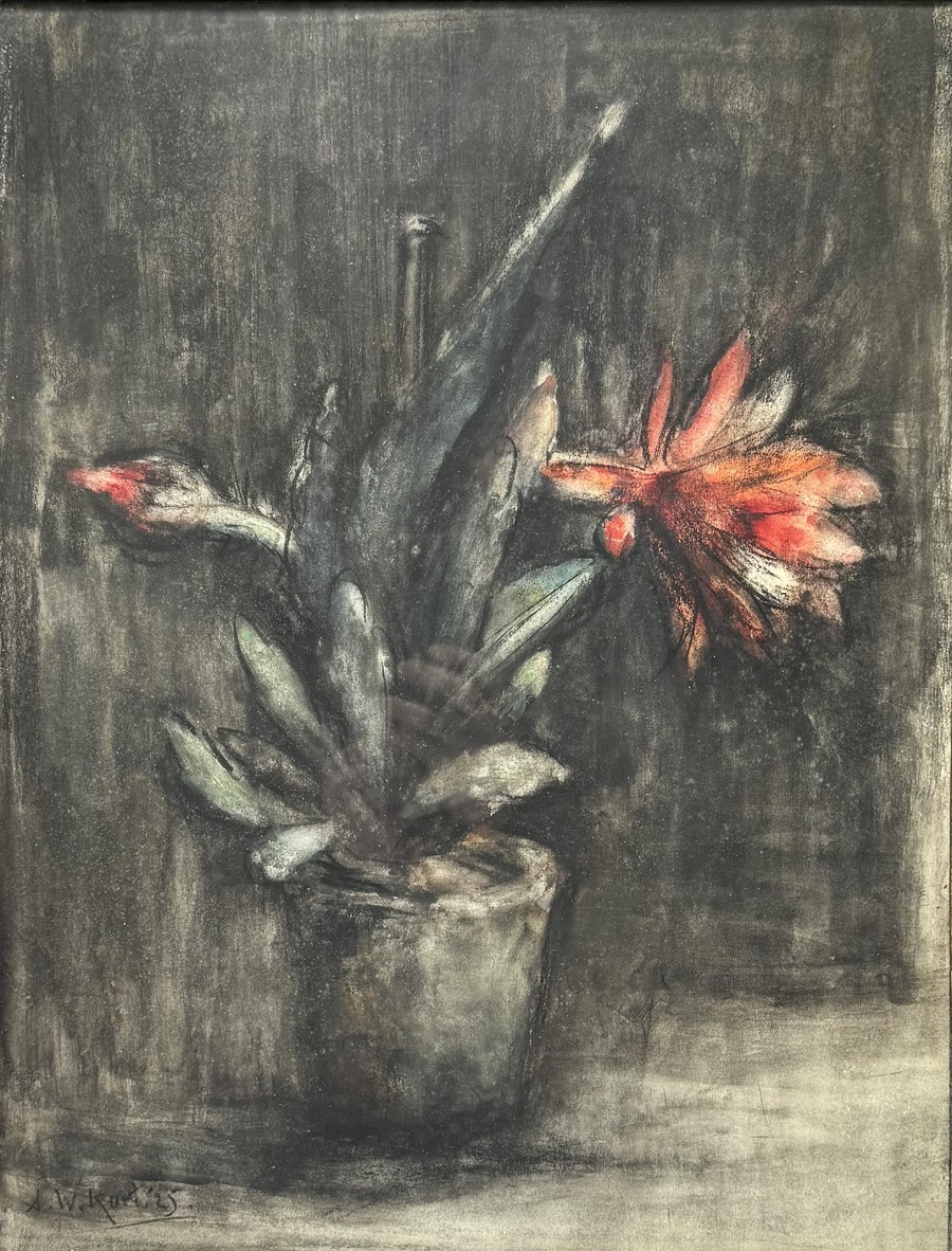 Aquarel van een bloemstilleven door Arnold Willem Kort (1881-1972), wijlen docent aan de Academie Minerva te Groningen. Linksonder gesigneerd en gedateerd '25.