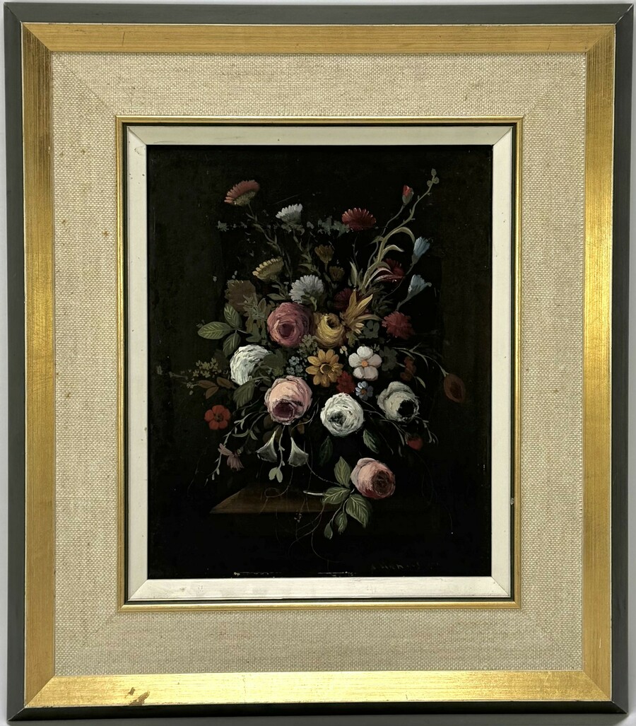 Schilderij van een bloemstilleven. Olieverfschilderij op messing plaat, onderin gesigneerd, jaren 50/60.