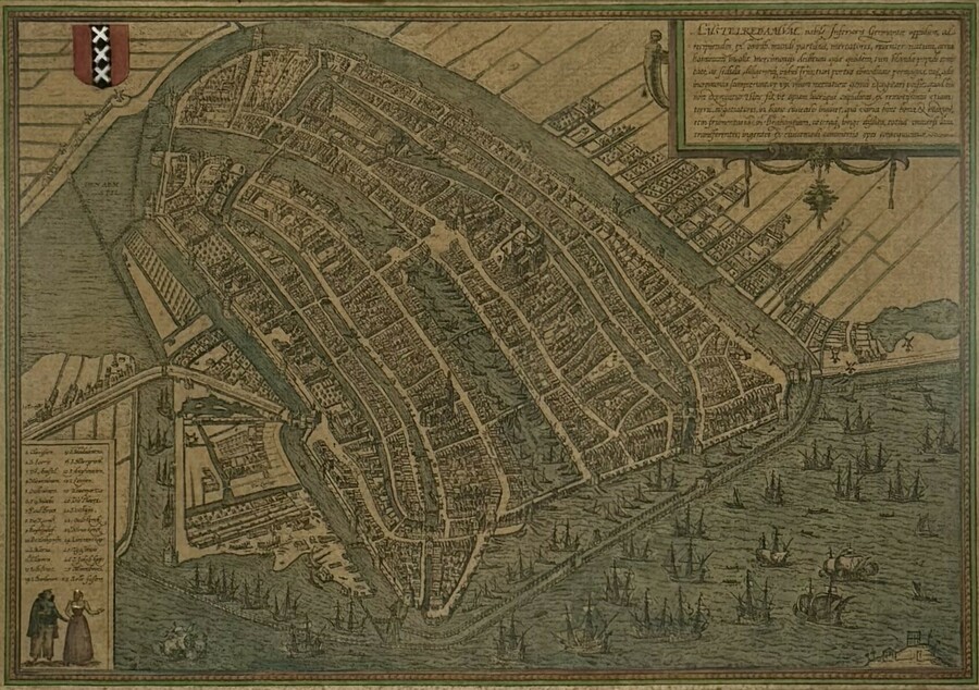 Kopergravure van plattegrond van de stad Amsterdam getiteld “Amstelredamum”. Het betreft een stadskaart uit de atlas samengesteld door Braun en Hogenberg in 1583, met linksonder op de gravure tekeningen van figuren in klederdracht, ingekleurd met penseel, eind 16e eeuw.