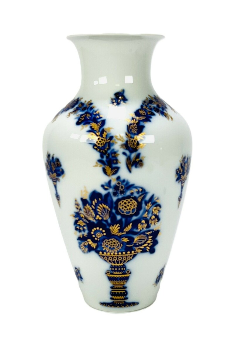 Vaas van porselein, kobalt met goud decor, gemaakt door Heinrich Germany. Gemarkeerd aan de onderzijde met fabrikantenmerk en Echt Kobalt. Productieperiode 1970 tot 1979.