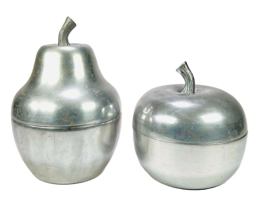 Twee aluminium design ijsemmers met plastic binnenbak, in peer en appel vorm. Italië, jaren 60
