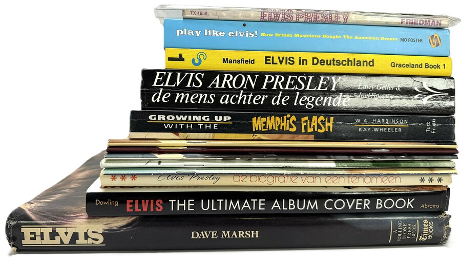 Convoluut Elvis Presley boeken en tijdschriften met onder meer “Elvis” door Dave Marsh, Elvis Presley de mens achter de legende, Elvis in Duitsland, The ultimate album coverboek en vijf tijdschriften It’s Elvis Time. Vierde kwart 20e eeuw.