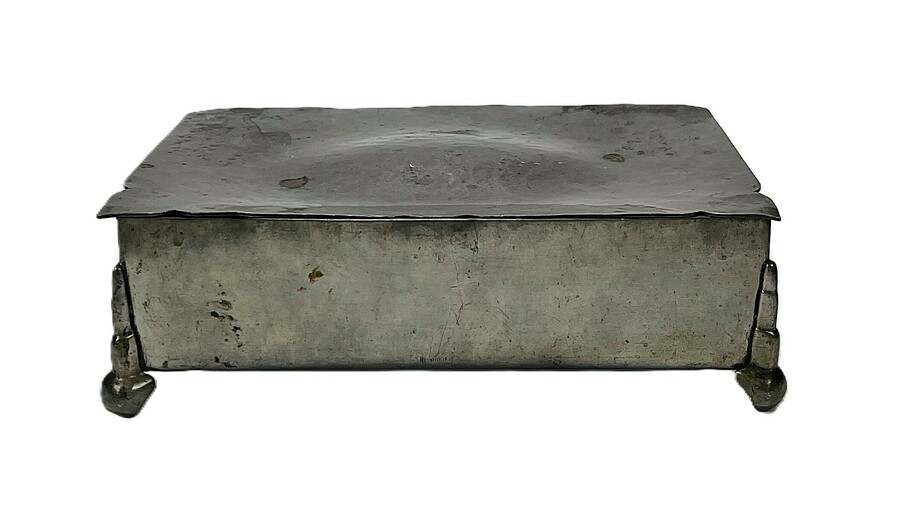 Amsterdamse School tinnen sigarendoos op vier pootjes, met houten binnenzijde. Eerste helft 20ste eeuw.