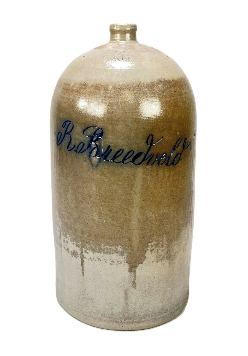 Aardewerken jeneverkruik met opschrift R. Breedveld. Aan de bovenzijde gemerkt KAN 10, betreft een kruik op groter formaat, eerste helft 20e eeuw.