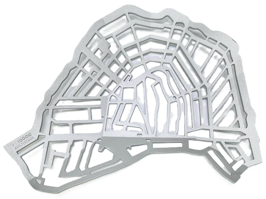 In 2010 door Frederik Roijé ontworpen metrobowl schaal van gegoten aluminium, licht gematteerd.. Schaal 1:10000, één centimeter schaal is 100 meter Amsterdam.